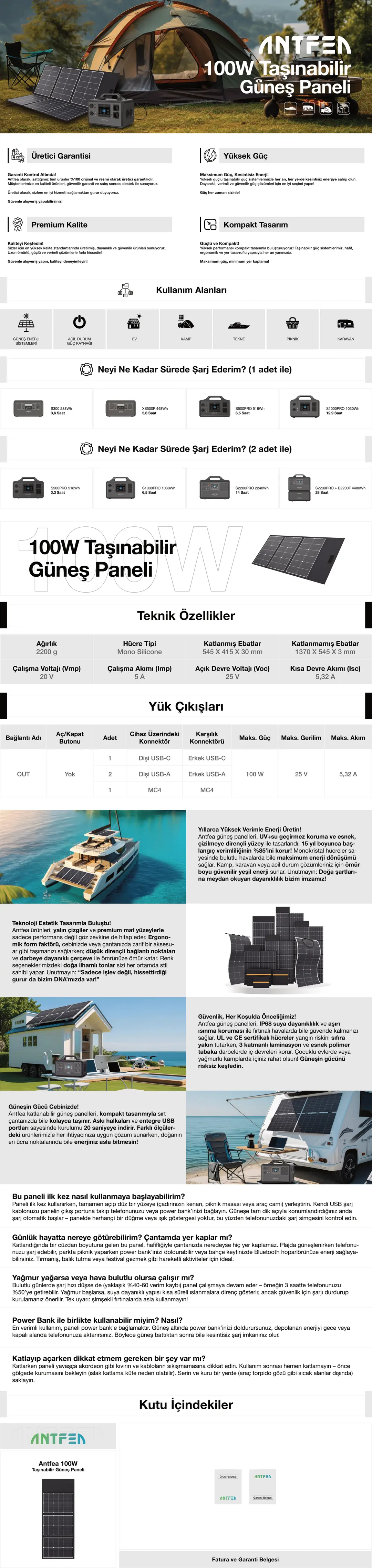 Antfea 100W panel, katlanabilir yapısı ve hafif tasarımı sayesinde kolayca taşınır. Kamp alanlarında hızlı kurulum imkânı sunar, araç içi ve dış mekân kullanımlarında pratiklik sağlar.