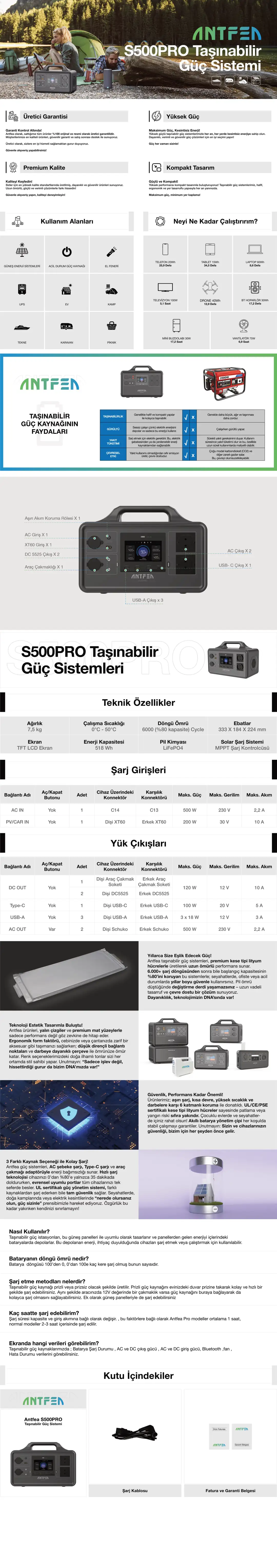 Antfea S500Pro Taşınabilir Güç Sistemi 500W, her yerde güvenilir, pratik ve sessiz enerji arayan kullanıcılar için Solarpanelim.com güvencesiyle ideal bir tercihtir.